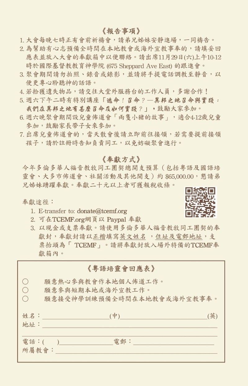 今年同工團契、佈道會及培靈會開支預算為加幣$65,000,多謝大家的愛心奉獻。